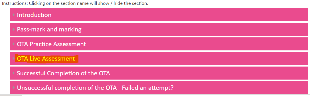 Once payment is complete and you have had confirmation that your reasonable adjustment has been applied (if you requested one), you can now access the assessment area. On this page, there's a practice assessment which we recommend taking first to familiarise yourself with the format of the OTA before doing the live assessment.