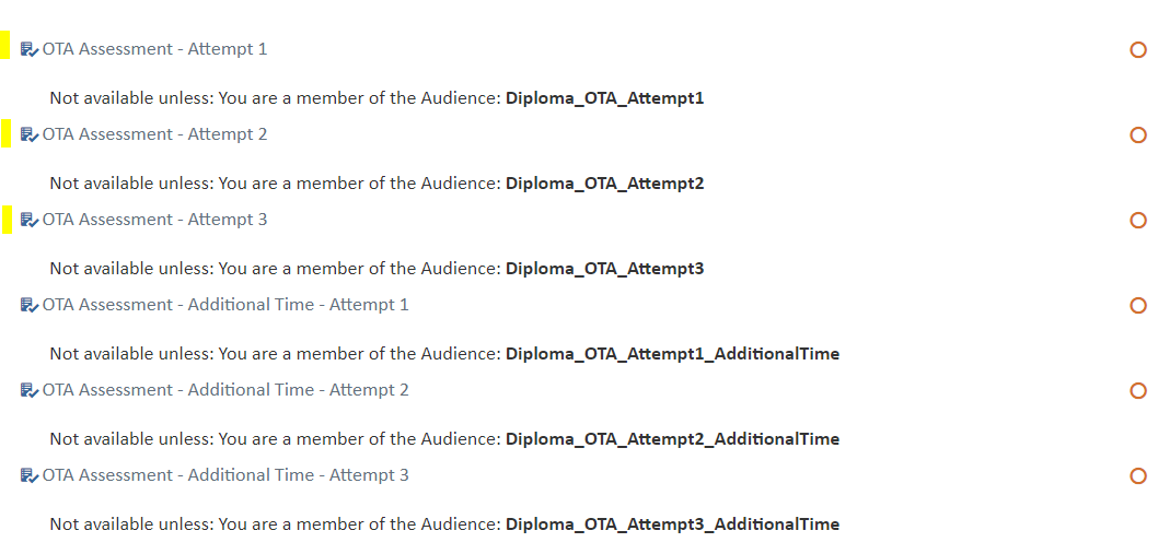 2. Link is orange and the circle is open - This link is open and contains an available attempt for you.