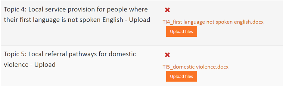 When selecting same 5x Topic Investigation - Upload area as in the image above, you will be able to see any uploaded files above the upload files button by selecting the orange hyperlink with each files name.