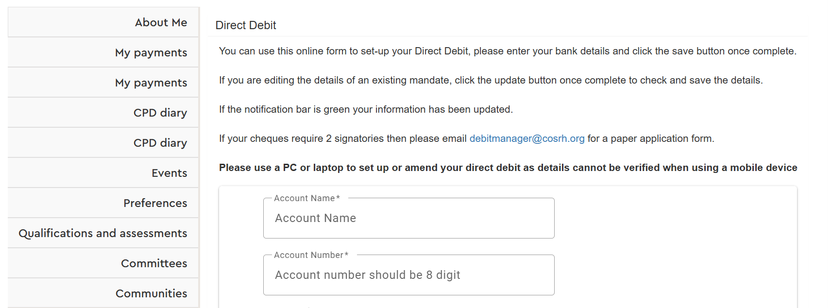 To set up an annual or monthly Direct Debit, go to www.cosrh.org and log-in to MyCoSRH account. Go to My Account and then Direct Debit mandate on the left hand side.