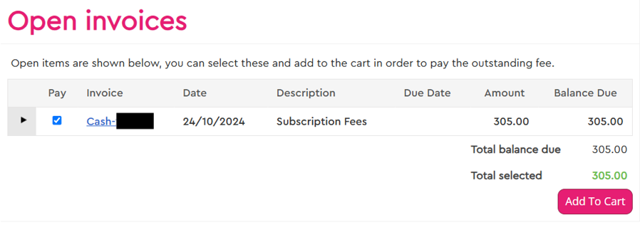 Go to www.cosrh.org and log into your MyCoSRH account. Go to My Account and My Payments and then scroll down to Open invoices. You will see your outstanding membership fees listed (the amount shown below is just as an example):